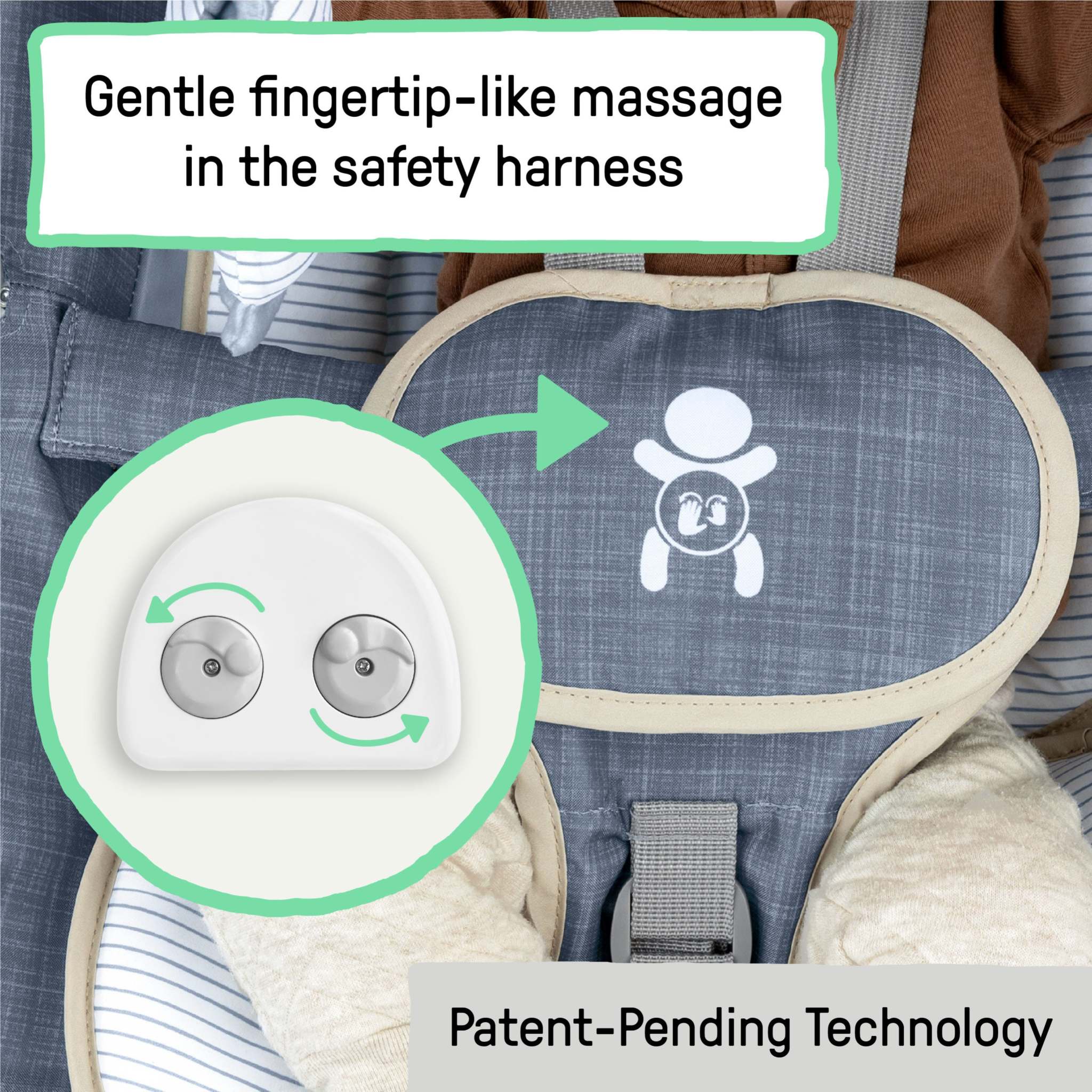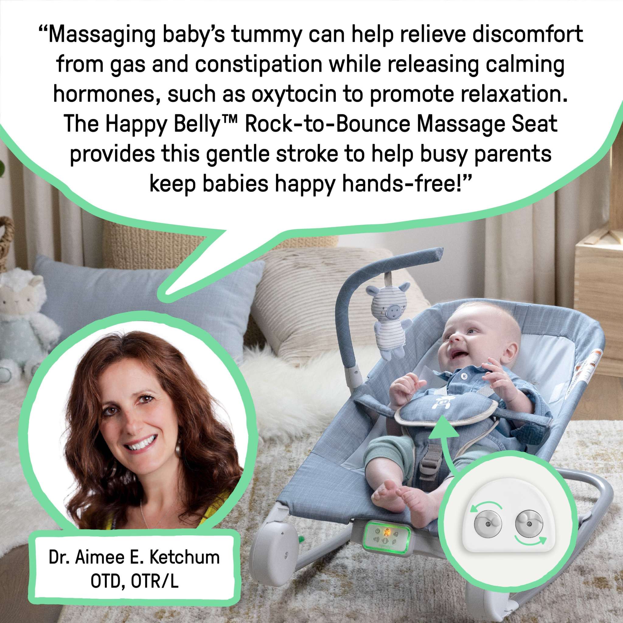 • The belly massage rollers resemble a gentle fingertip massage and are safely activated by a parent's push of a button; Designed in the USA with expert-led medical advice