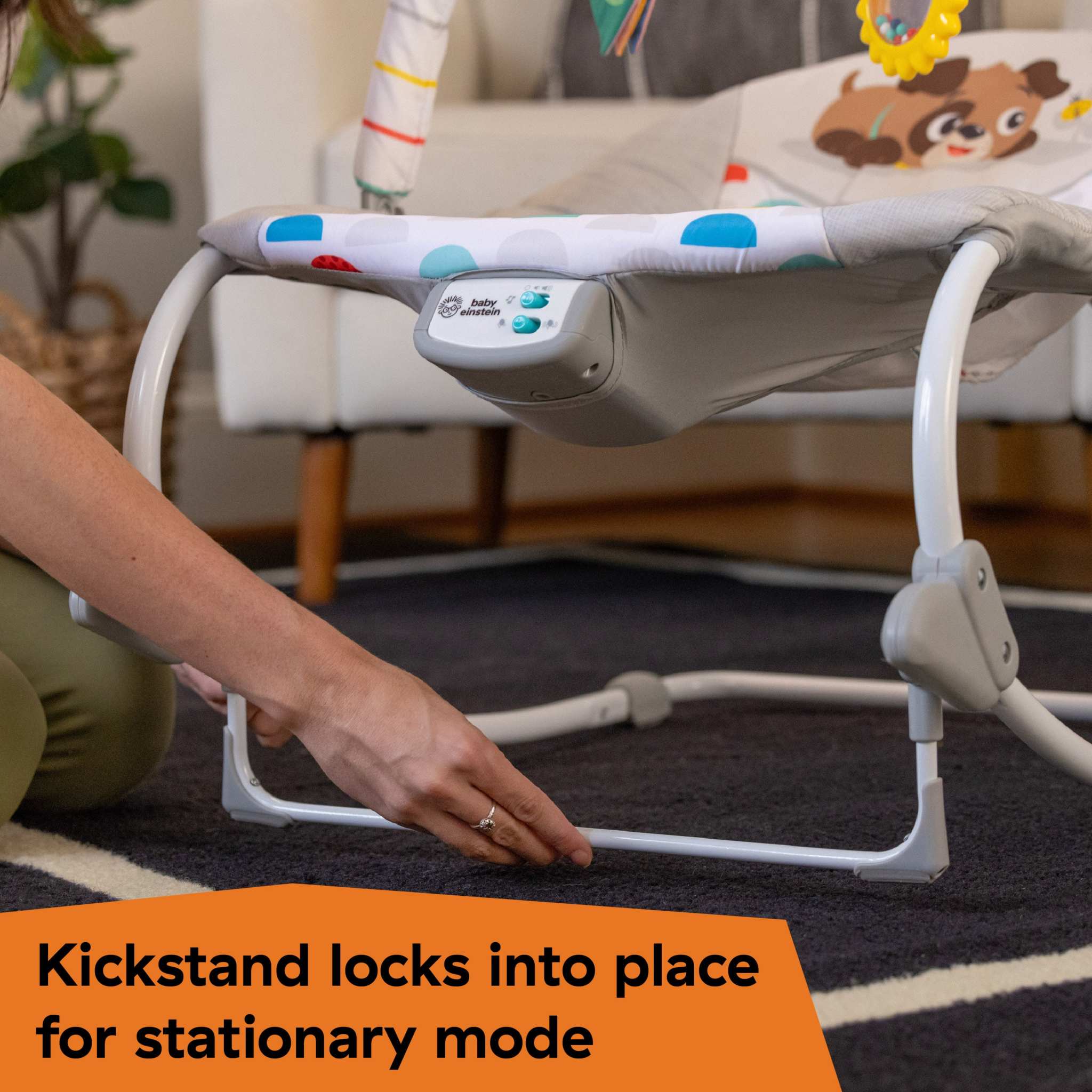 One seat, two ways to soothe and engage baby from ages 0 months to the toddler years! The Baby Einstein Dean’s Discovery Spot Musical Infant to Toddler Rocker is the perfect seat to help calm and entertain baby while you enjoy a few handsfree moments nearby. Designed in the USA by the #1 Manufacturer of Bouncers*, your baby can relax, listen to music, and explore the senses as they sit or rock. Soothe and engage baby with 20+ minutes of gentle vibrations and melodies. Adults can gently rock the seat to help baby relax or use the kickstand to make the seat stationary. 2 dangling toys on the toy sleeve encourage batting and reaching: rattle bead sun and crinkle book. As baby grows, remove the toy bar and disengage the kickstand to transform into a toddler rocker! Features Dean the Dog. Dimensions: 24.02" (H) x 19.69" (W) x 27.17" (L). Requires 3 C batteries (not included). Machine washable seat pad. 2-position recline. Maximum weight for use: 40 pounds. 5-point safety harness. Third party safety tested and approved. Not for sleep use. (*Circana, Retail Tracking Service, U.S., Bouncers, dollar sales, 12 months ending October 2023)