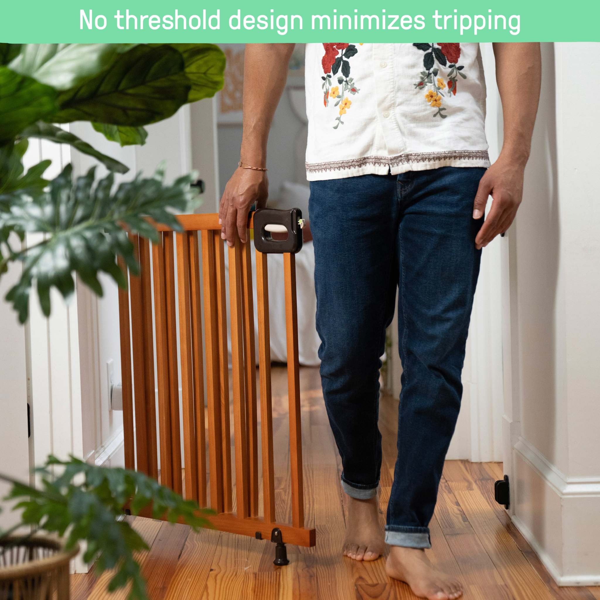 The Stairway wooden safety baby and dog gate with comfort grip handle and no-threshold design in brown