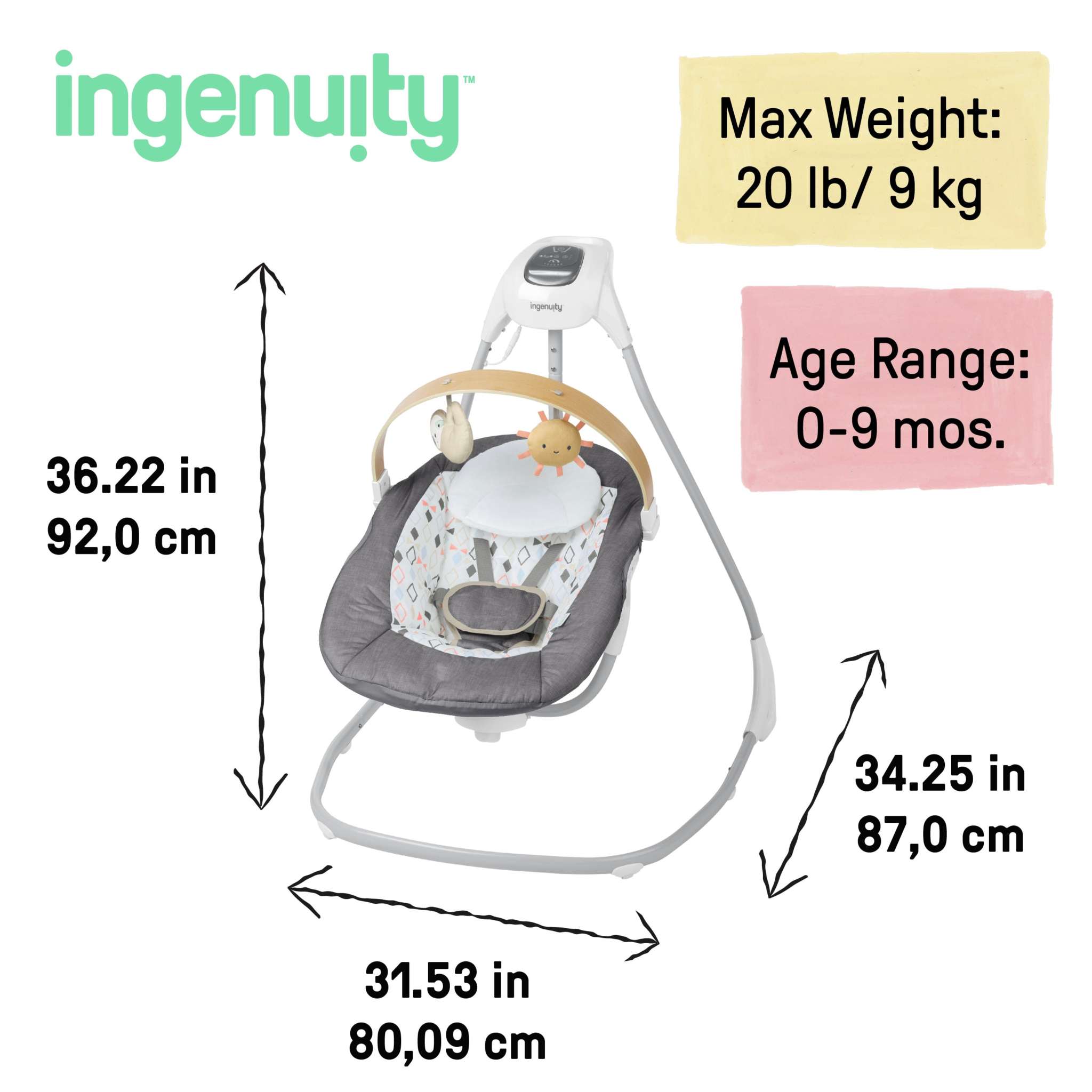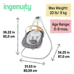 Entertain baby while complementing your home décor with the Ingenuity SimpleComfort Compact Soothing Swing! Designed for ultimate comfort, this swing from the #1 Manufacturer of Baby Entertainment* is a new parent “must-have”. The rotating and removable wooden toy bar is sustainably sourced and adds a touch of luxe detail. Raffi the Giraffe and Casi the Zebra interactive toys provide colorful stimuli for play and detach for on the go fun. The seat rotates 180 degrees and swings in 3 directions, giving you a few handsfree moments. 6 speeds featuring our TrueSpeed weight sensing technology with timer and auto shut-off. When baby needs to be entertained, 8 melodies and 3 soft nature sounds keep your little one engaged. The swing motion and music is powered by a USB cord (included). A 5-point safety harness keeps baby secure as they relax. Third party safety tested and approved. For ages 0-9 months or up to 20 pounds, whichever comes first. Assembled dimensions: 36.22" x 31.53" x 34.25." Makes for a great gift for the stylish parent (and baby) in your life! Designed in the USA. From the #1 Manufacturer of Baby Entertainment* (*Circana, US Dollar Sales, Jan-Dec ‘24).