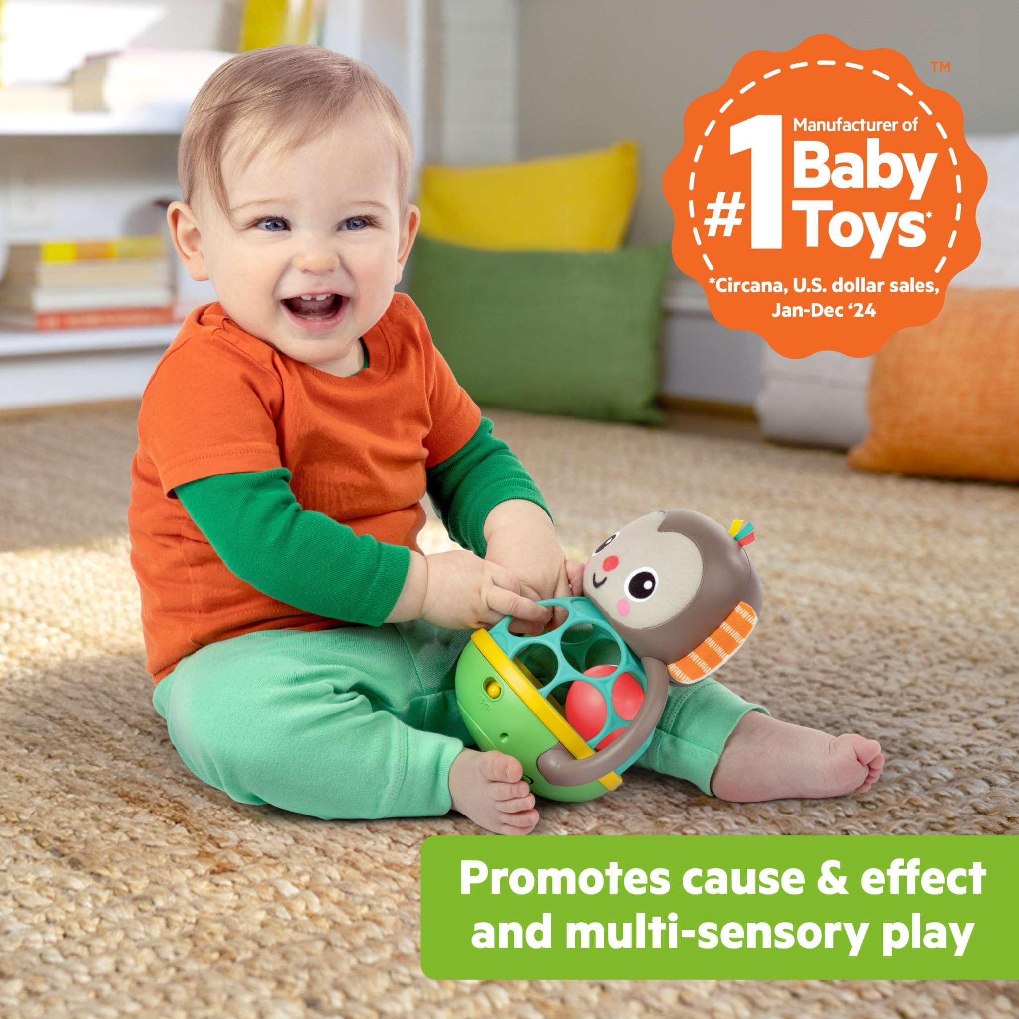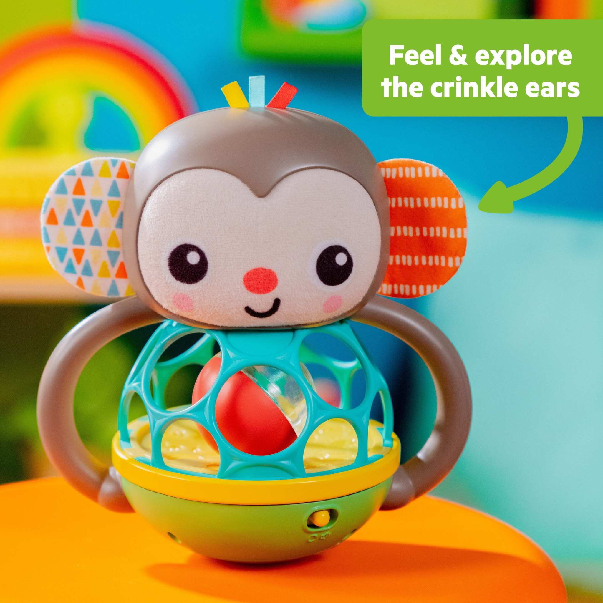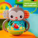 • Grasp, shake, and explore the Grab & Giggle Monkey; activate 20+ silly sounds, giggles, and multi-colored lights; includes rattle beads, plush crinkle face/ear, and satin ribbons