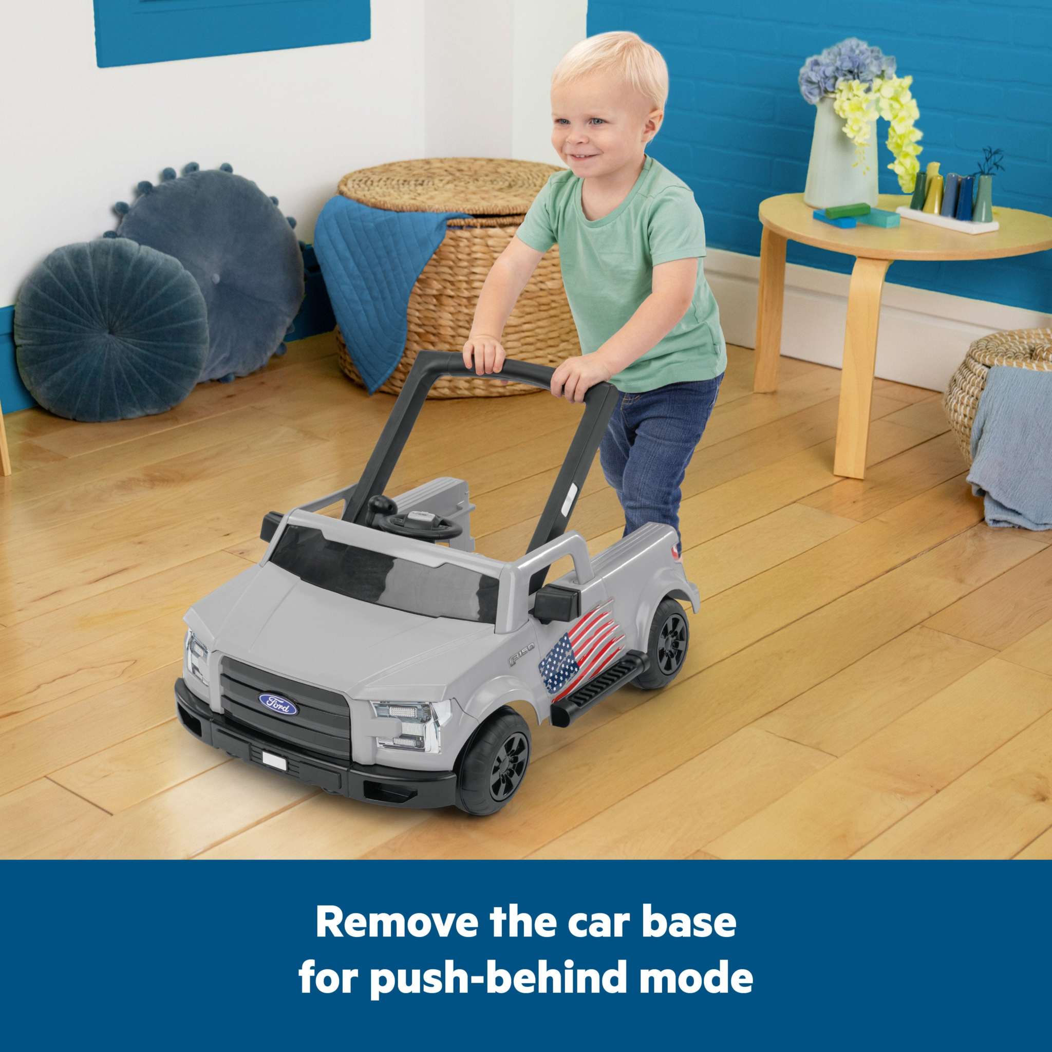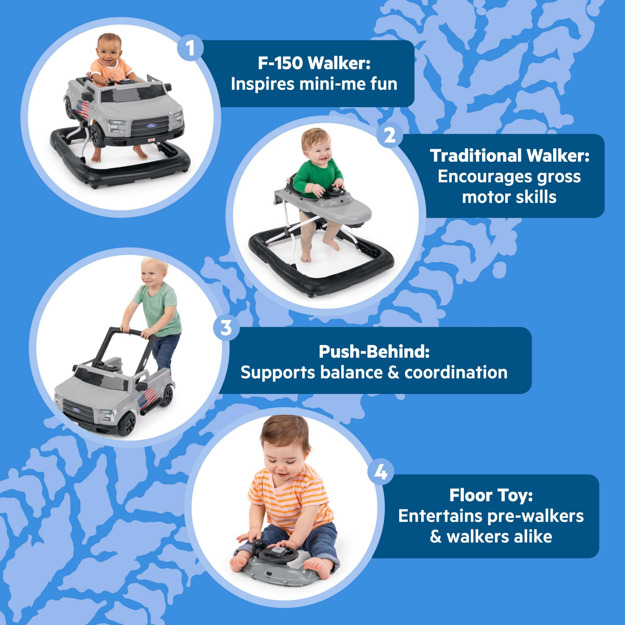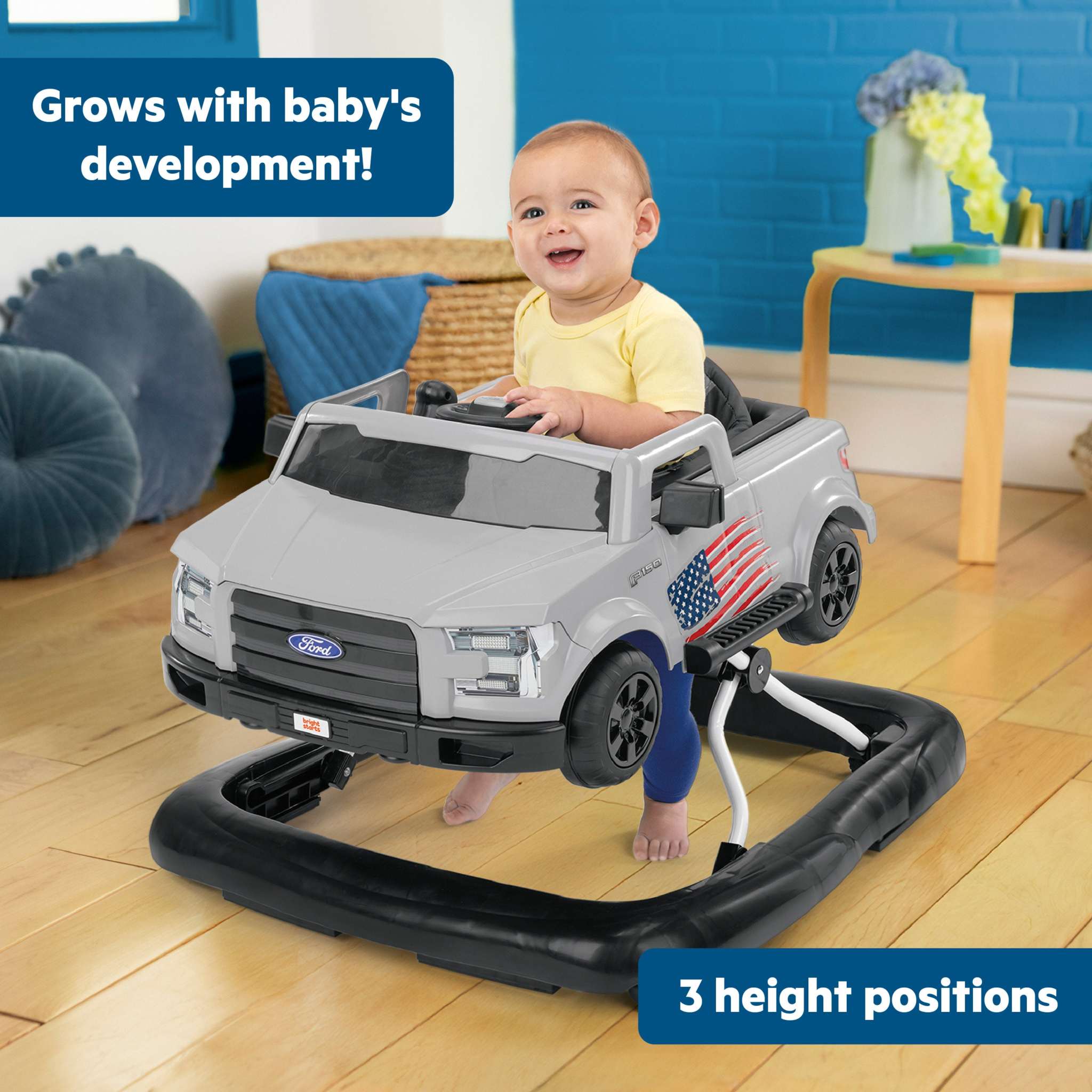 Rev your engines and bring the spirit of the open road right into playtime with the All-American Ford F-150 Walker by Bright Starts, the #1 manufacturer of walkers!* Designed for the little adventurer and decked out with red, white, and blue decals, the Ford F-150 Walker combines rugged, timeless style with high-energy fun. Let baby cruise in true American spirit with 4 Ways to Play: walker with car frame, walker mode without car frame, push-behind mode, and sit & play! Two kids can play at once in walker and push-behind modes for double the fun! The removable baby activity center includes authentic truck sounds, lights, a gear shifter, and a steering wheel made for exploring. Features sturdy wheels suitable for bare floors or carpet and adjusts to 3 height positions. Seat pad is extra comfy and machine washable for easy cleanup. Easy to set up and folds flat for travel and storage. For ages 6 months and up. This walker is thoughtfully designed to meet all required safety standards. Please follow all product warnings including never leaving your child unattended, keeping children away from hot surfaces and hazards, and blocking stairs before use. (*Circana, Retail Tracking Service, U.S., Basic Walkers, dollar sales, 12 months ending October 2023)