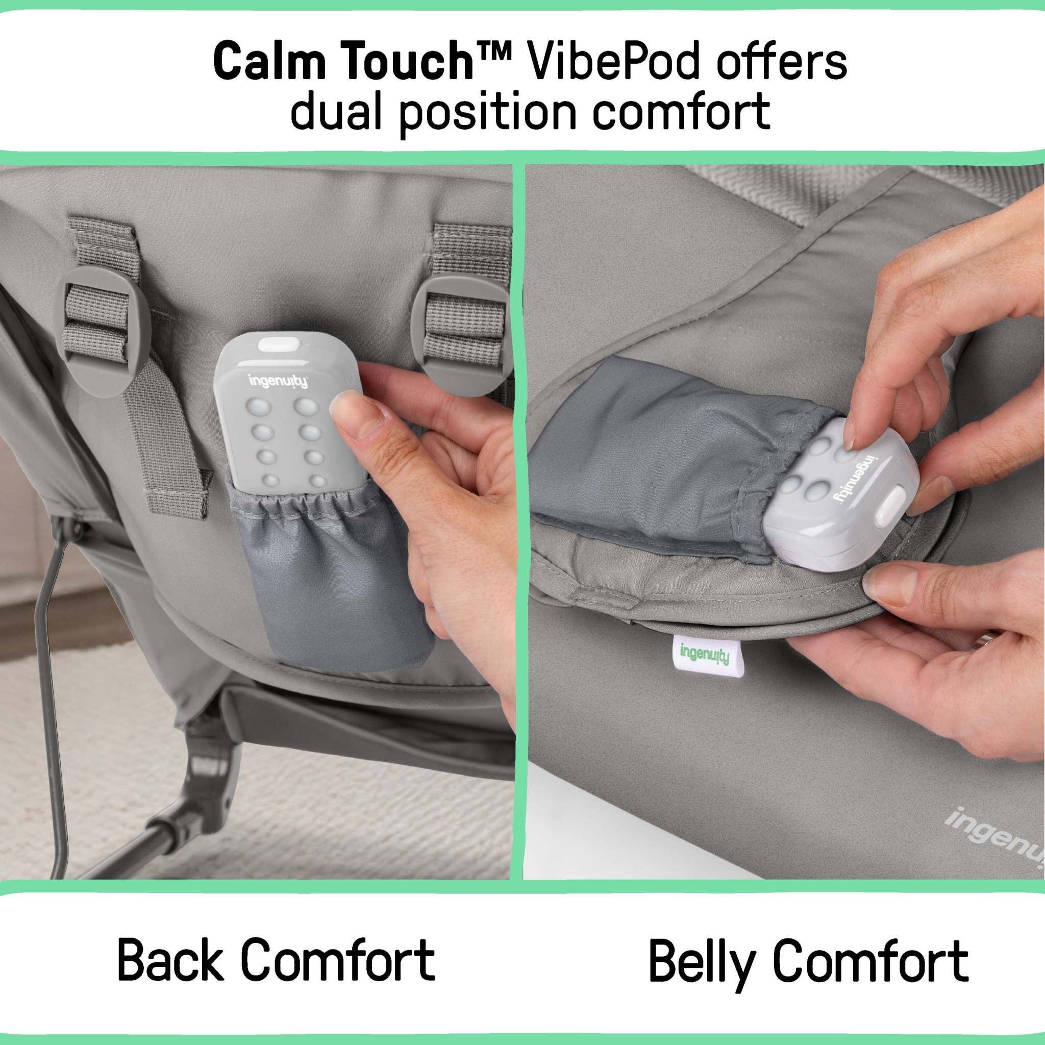 • Two-position recline and movable CalmTouch Vibe-Pod unit provide gentle vibration on baby’s belly or back, offering extra soothing support