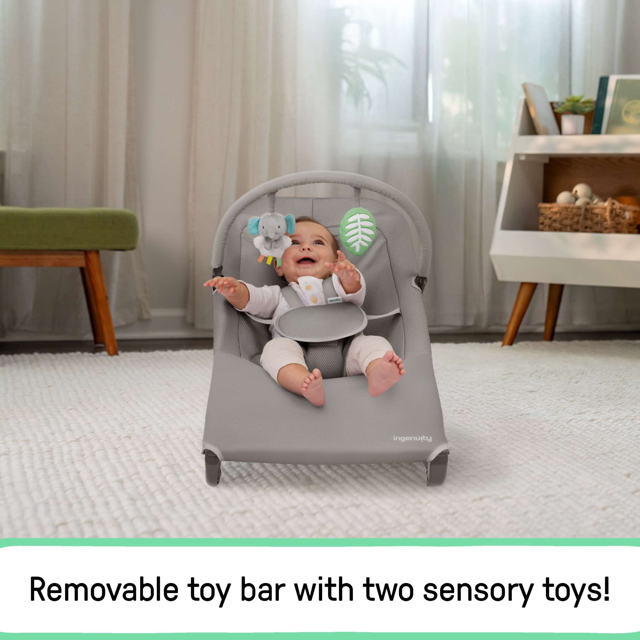 • Removable toy bar with two engaging toys, a crinkly plant and a soft elephant, encourages reaching, grasping, and early sensory exploration