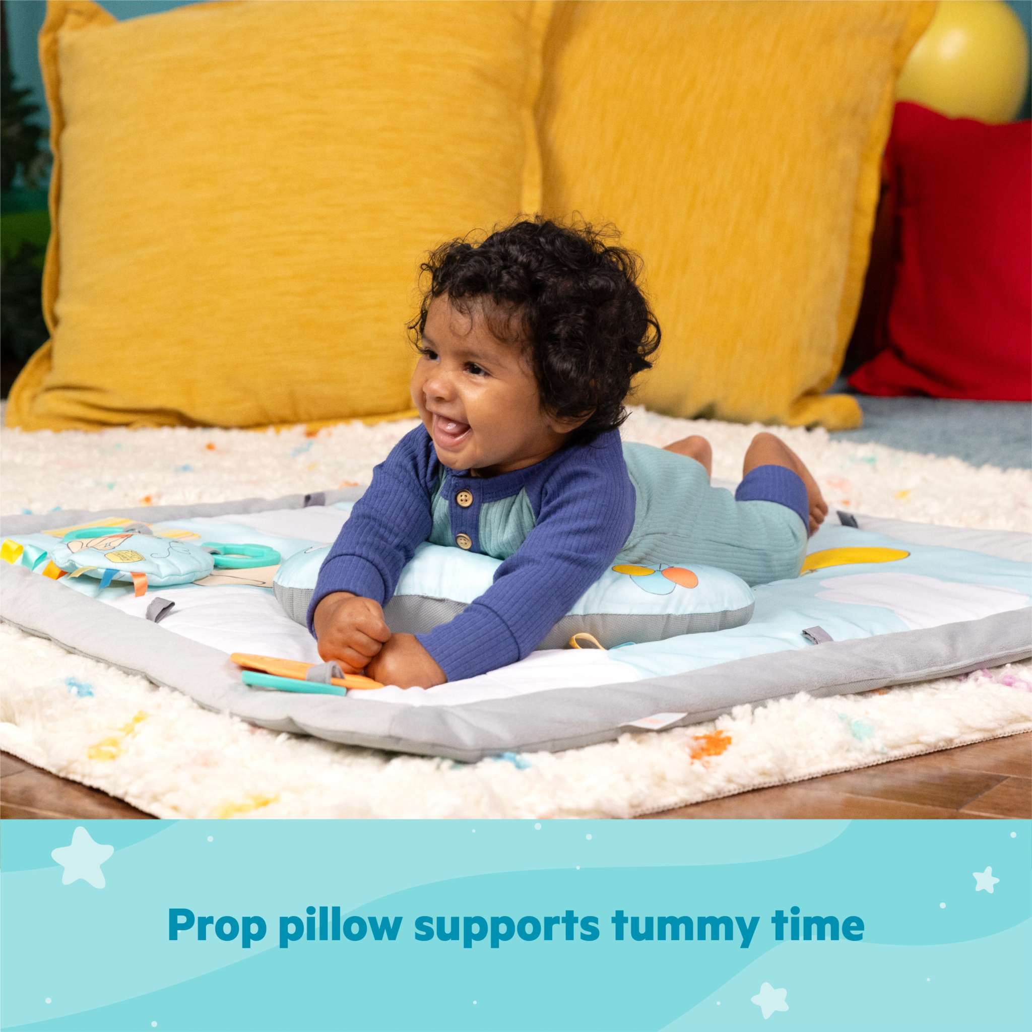 • Includes prop pillow to support younger babies during tummy time; soft mat includes sensory tags and baby-safe mirror for tummy time entertainment; encourage baby’s fine motor skills by reaching and batting at the toys above