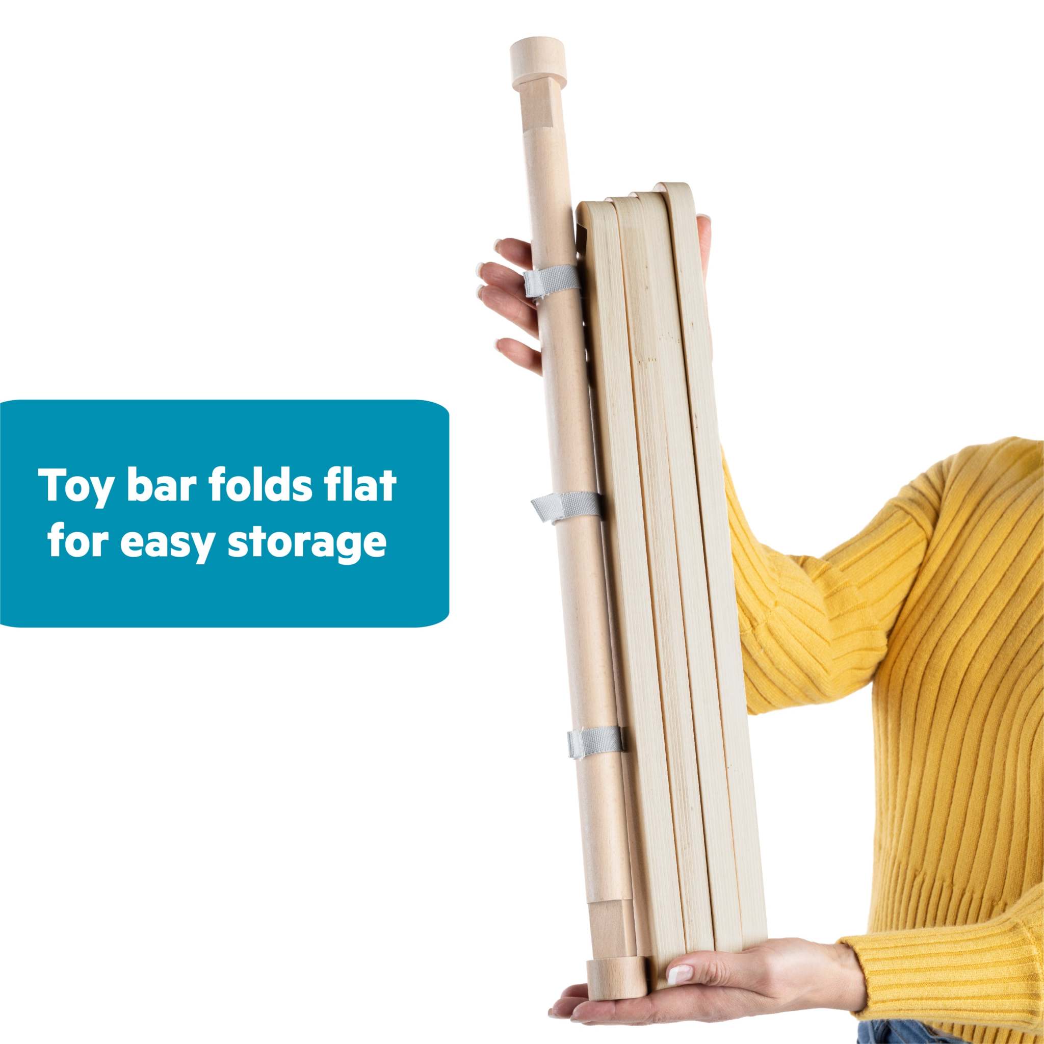 • Durable wooden A-frame toy bar features 3 removable toys: plush rattle with ribbons, Winnie the Pooh character flash cards with numbers, and honeypot texture toy. Toy bar is easy to disassemble and folds flat when not in use