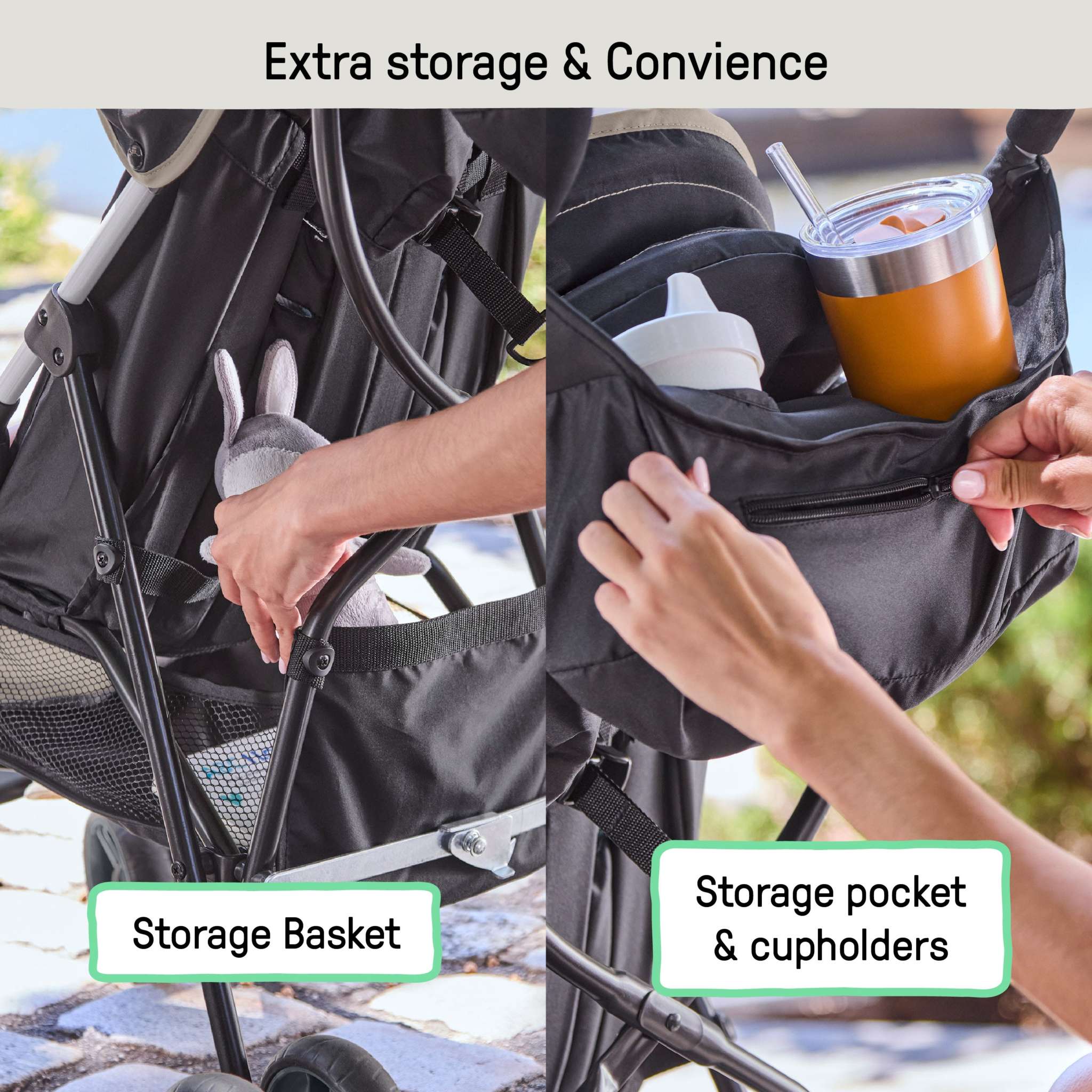 • EXTRA STORAGE - With plenty of storage in this stroller, you won’t have to leave anything at home; It includes a storage basket, rear storage pocket and two cup holders