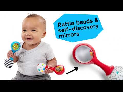 • Tambourine features muted jingles to protect tiny ears; maracas engage baby’s eyes and ears with multisensory features including visible rattle beads, self-discovery mirror, and crinkle plush ends